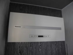 F屋根工事と同時進行で壁面に接続箱を取付けます。これで太陽光パネルからのケーブルを一つにまとめて屋内へ引込みます。
