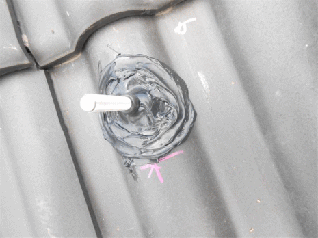 C金具のアンカー部分から瓦が飛び出るようにあらかじめ瓦に穴を空けておき瓦を戻し変成シリコンで穴を埋め防水キャップをかぶせ、更に変成シリコンで防水処置を行います。 |