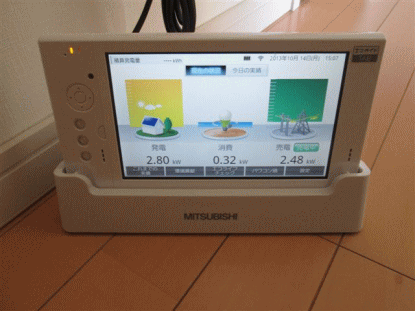 G発電モニタです。送信機から電波を飛ばしてこのモニタから発電電力量・消費電力量・売電電力量が確認できます。 |