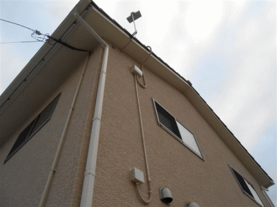 G屋根工事を同時進行で、壁面に接続箱を取り付けます。これで太陽光パネルからのケーブルを一つにまとめて屋内へ引込みます。 |