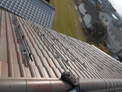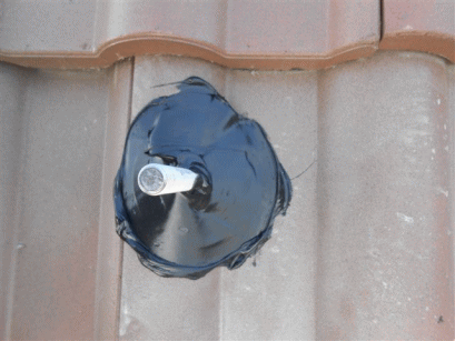 C金具のアンカー部分が瓦から飛び出るように、あらかじめ瓦に穴を空けておき瓦を戻し、変成シリコンで穴を埋め防水キャップをかぶせ、更に変成シリコンで防水処置を行います。 |