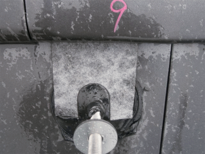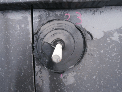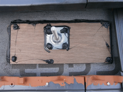 | B補強板の上にアンカー金具を固定します。雨漏れしないように周囲を変成シリコンで防水処置していきます。 |