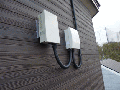 G屋根工事を同時進行で、壁面に接続箱を取り付けます。これで太陽光パネルからのケーブルを一つにまとめて屋内へ引込みます。 |
