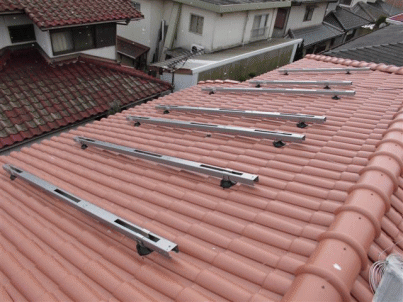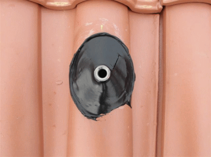 Dアンカー部分が瓦から飛び出るように、瓦に穴を開けておきます。瓦を戻し、変成シリコンで穴を埋め防水キャップかぶせ、更に変成シリコンで防水処置を行います。