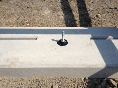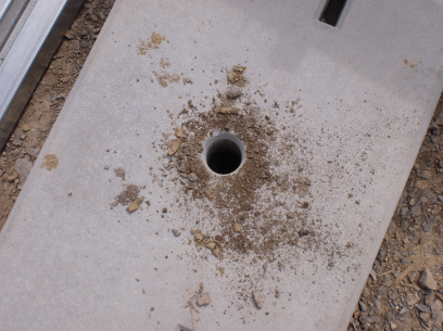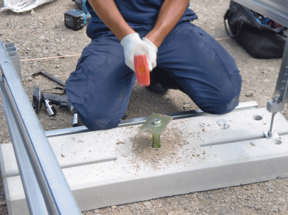 M置き基礎の真ん中にある穴へ地中抵抗アンカーを埋め込んでいきます。 |