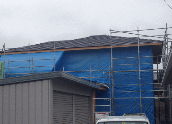 E屋根工事と同時進行で壁面に接続箱を取付けます。これで太陽光パネルからのケーブルを一つにまとめて屋内へ引込みます。 |