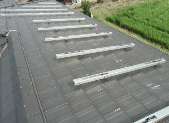 A家の屋根。アンカー金具を固定するため、金具取付け位置の瓦を取り外し補強板を取付けます。 |
